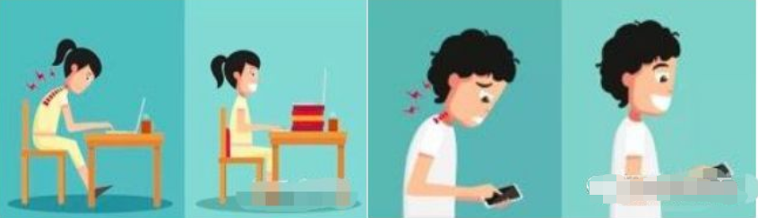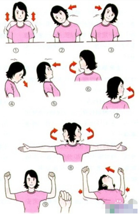 可用手机设置闹铃,每40-50分钟活动一会儿,做些简单的拉伸、放松动作,3-5分钟即可。如随时可以做的如下2张图里的颈椎放松操,动作一定要轻柔、缓慢。