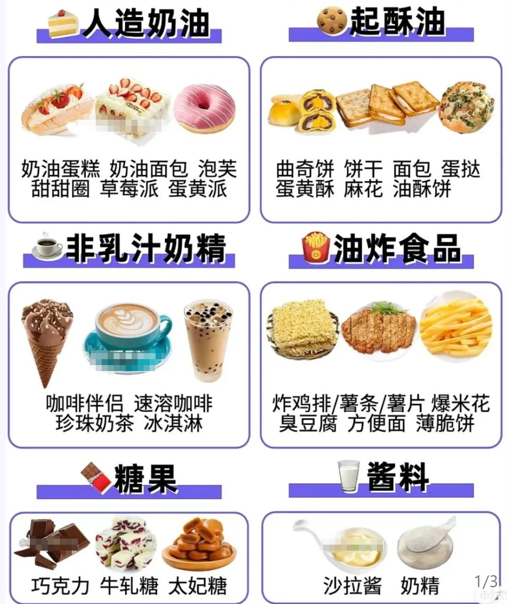 普通家长及患者通常很难区别食物是否含反式脂肪,直接不吃一切有“奶香味”的零食即可,如下图所示常见含有反式脂肪食物。