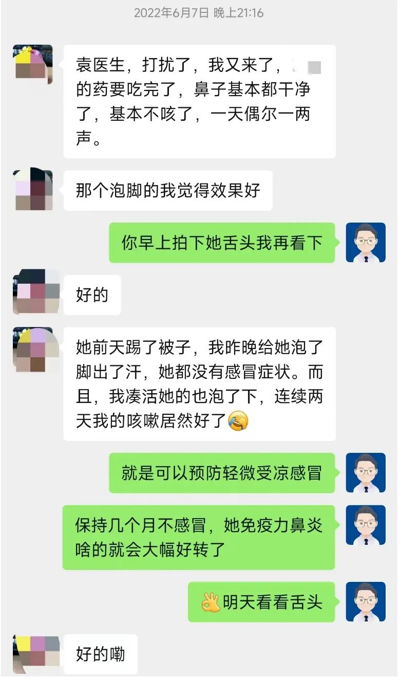 这种方式对于一般医生来其实从经济利益上并不有利,因为本来可以看诊很多次,治几个月的病人只看几次,然后自己泡脚就不怎么生病也不再找你了,泡脚药方即便医馆平台代做贵一点也就几块钱一包,一个月天天泡也不到100块钱。但作为医者,最重要的是追求疗效治愈病人。尤其袁医生自幼也饱受反复感冒诱发鼻炎的困扰,幼时又很讨厌吃药,以往如果知道泡脚这个办法可能就不会遭那么多罪了。
