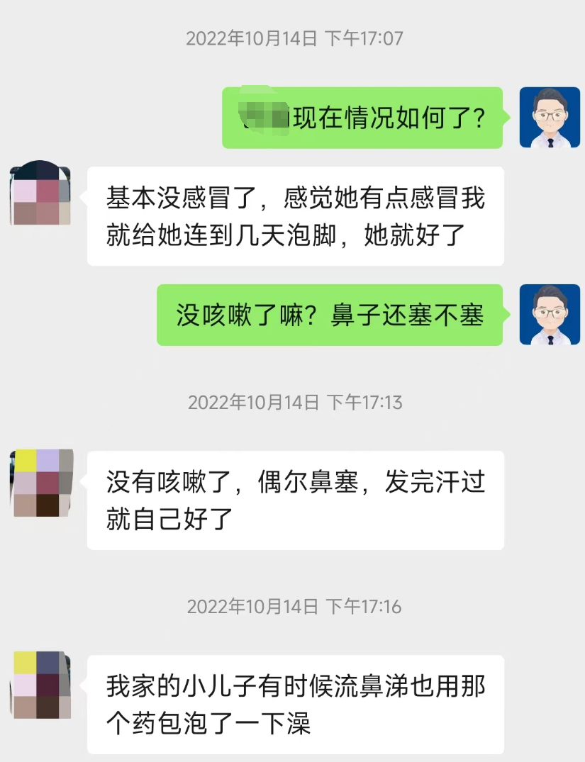 可以看到患儿再次外感,泡脚出汗后就很快截断了进一步发展诱发鼻炎,其母亲之前也有点感冒咳嗽,泡脚出汗后也痊愈了(泡脚药包一般不具备治疗效果,此处只是其咳嗽病情可能较轻微)。