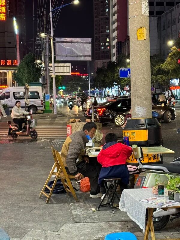 冬天的时候拍到的,卖烤红薯的父亲在路边辅导儿子写作业