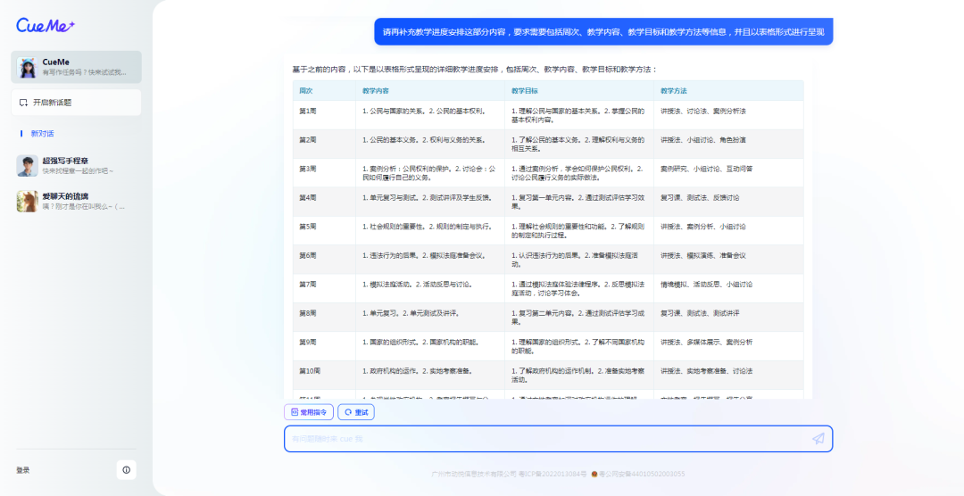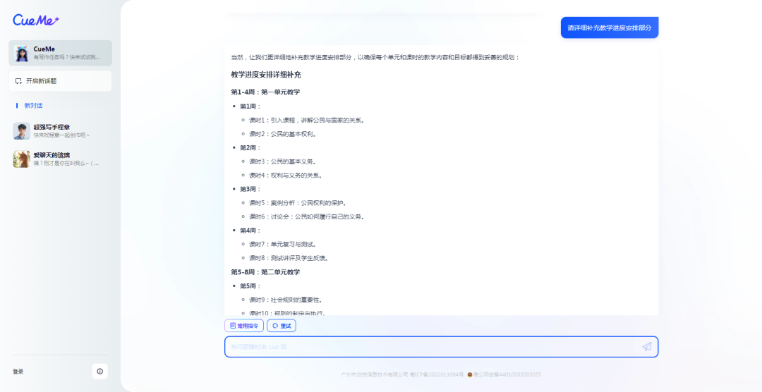 这里,我认为AI第一次给出的“教学进度安排”这部分的内容太过简单,所以就可以直接发送指令。
