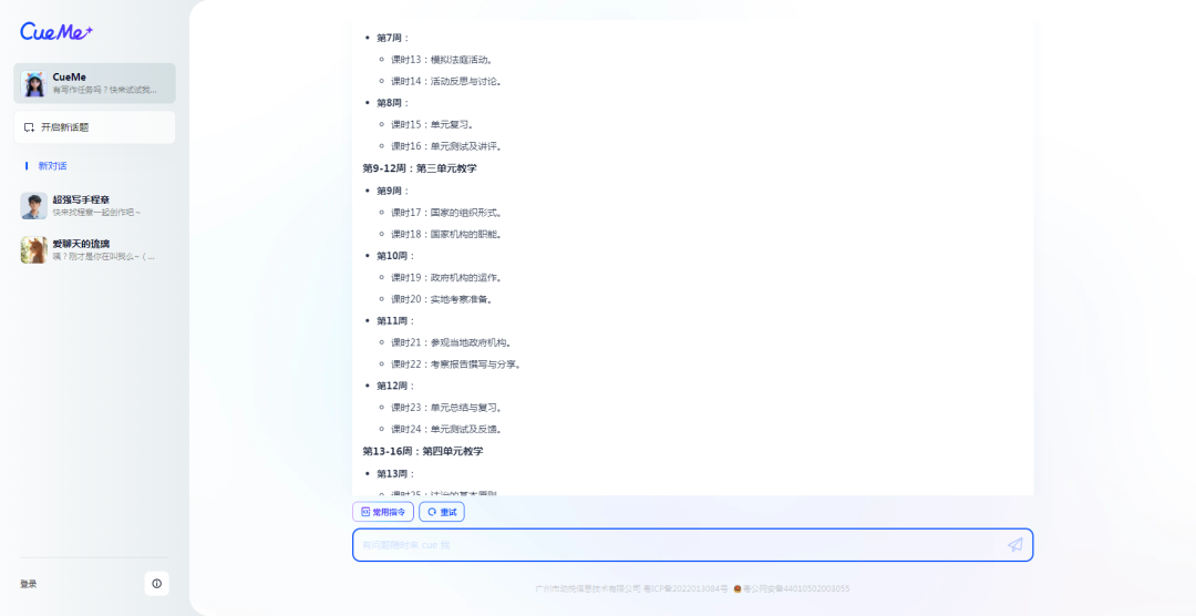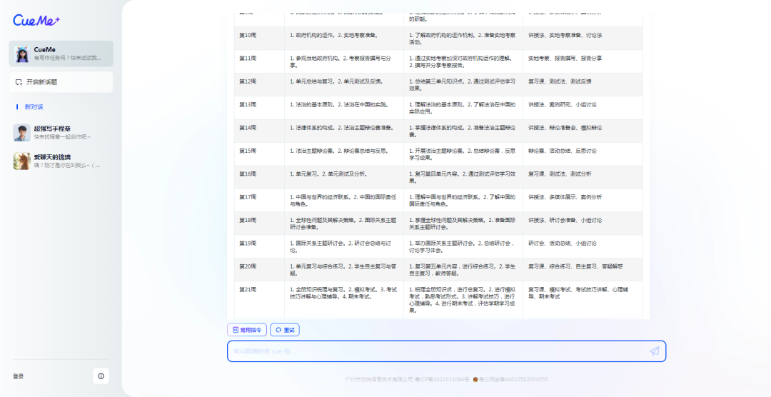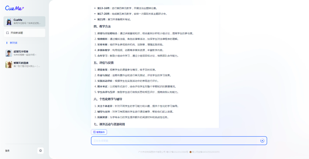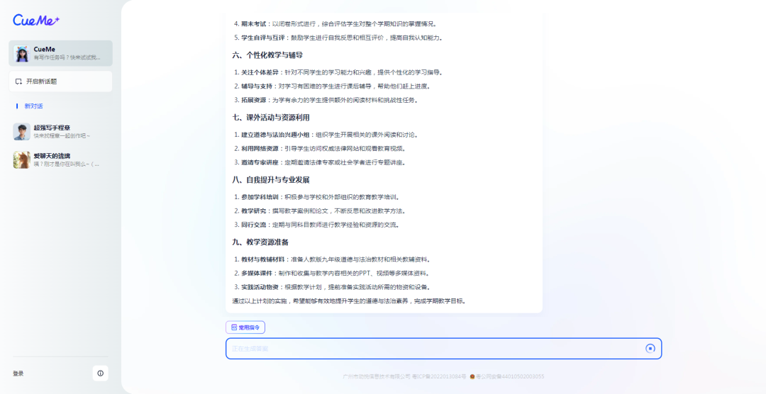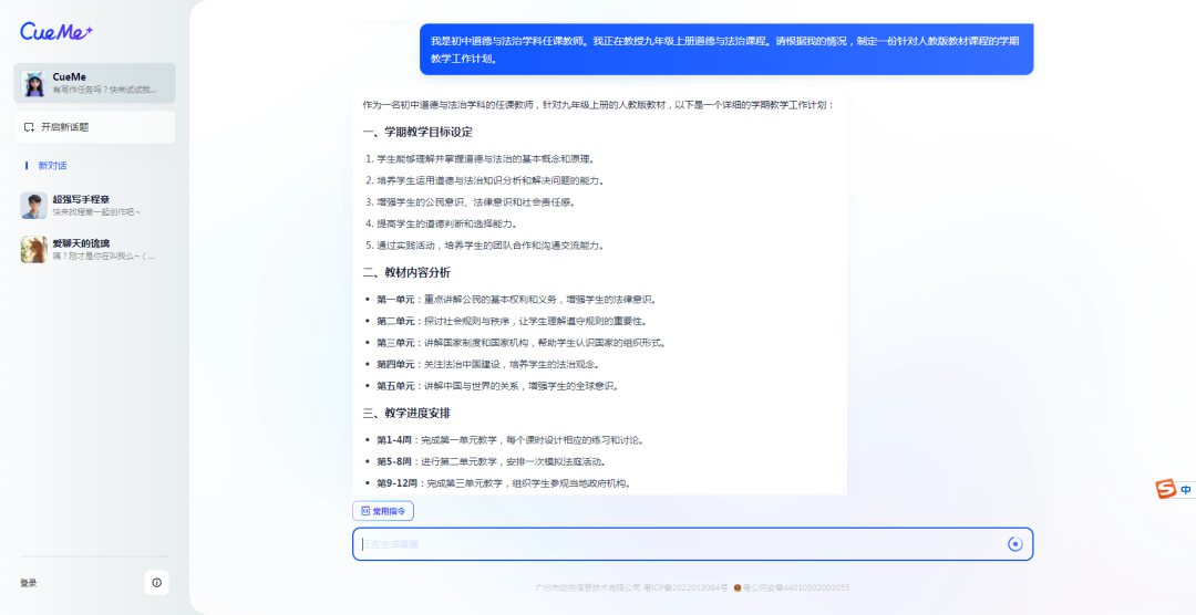 接下来,我们就以夸克旗下CueMe做相关演示,尝试用AI制定道德与法治学科的新学期教学工作计划。