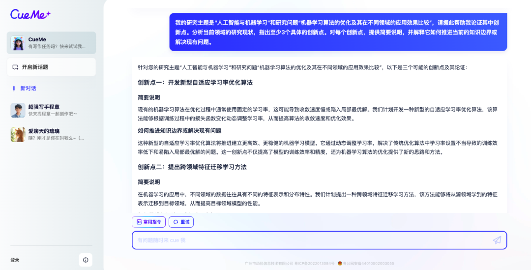 指令:我的研究主题是"人工智能与机器学习"和研究问题“机器学习算法的优化及其在不同领域的应用效果比较”,请据此帮助我论证其中创新点。分析当前领域的研究现状,指出至少3个具体的创新点。对每个创新点,提供简要说明,并解释它如何推进当前的知识边界或解决现有问题。