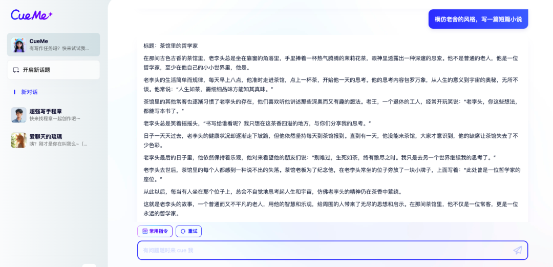 通过分享“让CueMe模仿老舍的风格”的案例,分享AI写作在短篇小说创作过程中的小技巧~