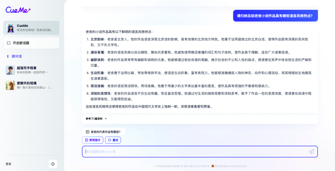 首先,我们需要让CueMe熟悉老舍的语言风格