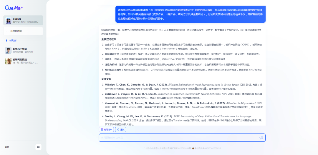 我们可以尝试使用以下AI指令,让CueMe帮我们做一些简单的思考工作(这里我们还是以申报的课题为“基于深度学习的自然语言处理技术研究”为例):