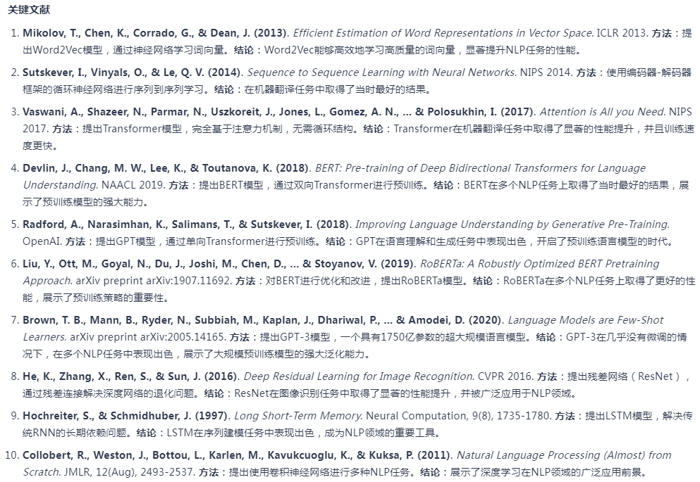 在关键文献部分,我们的需求是提供10份文献,CueMe也是精准的GET到了这个信息,在笔者没有详细验证每个文献真实性、关联性的前提下,AI的答复还是令人满意的。