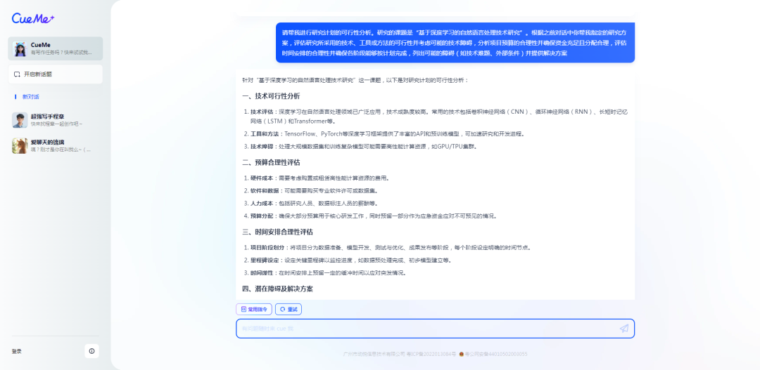 之前,AI陆续帮我们精准定义研究问题、构建理论与文献基础、设定研究目标与假设、选择研究方法与技术路线、识别并展示创新点、描述预期成果与应用场景、规划任务安排和时间表、明确资源配置、评估风险及应对措施。