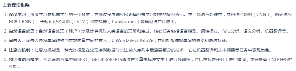 先看主要理论框架部分:AI可以清晰地介绍研究问题相关的主要理论和模型,并解释这些理论的核心内容。明确这些理论在领域中的重要地位以及其与研究问题的直接关联。