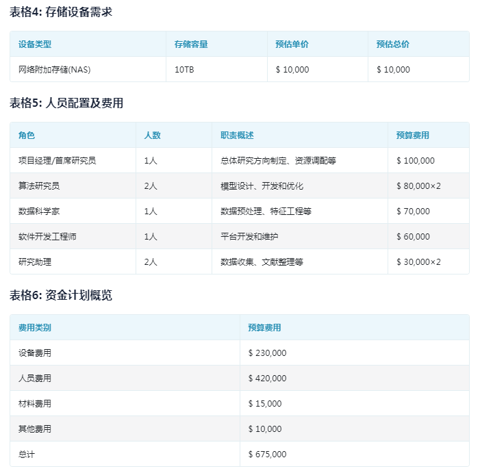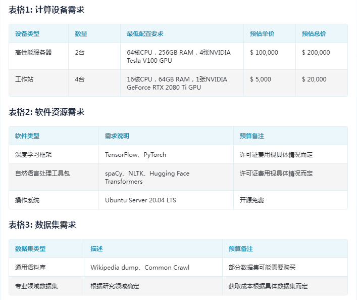 指令:请帮我明确研究项目所需的资源和人员配置。我的研究的课题是“基于深度学习的自然语言处理技术研究”。我需要你详细列出研究所需的所有设备和材料并确保数量、规格和成本的清晰说明,明确团队成员及其职责分工并确保每个成员的贡献与项目需求相匹配,制定详细的资金计划并列出各类费用(包括设备、人员、材料等的预估成本),识别可能的外部合作伙伴及其支持形式并规划如何有效管理这些合作关系。