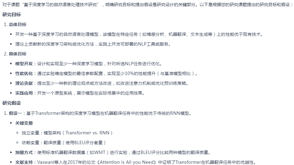 因为“设定研究目标与假设”这部分的要求比较多,所以我们在指令上也会要求的复杂一些,看看AI返回的结果如何: