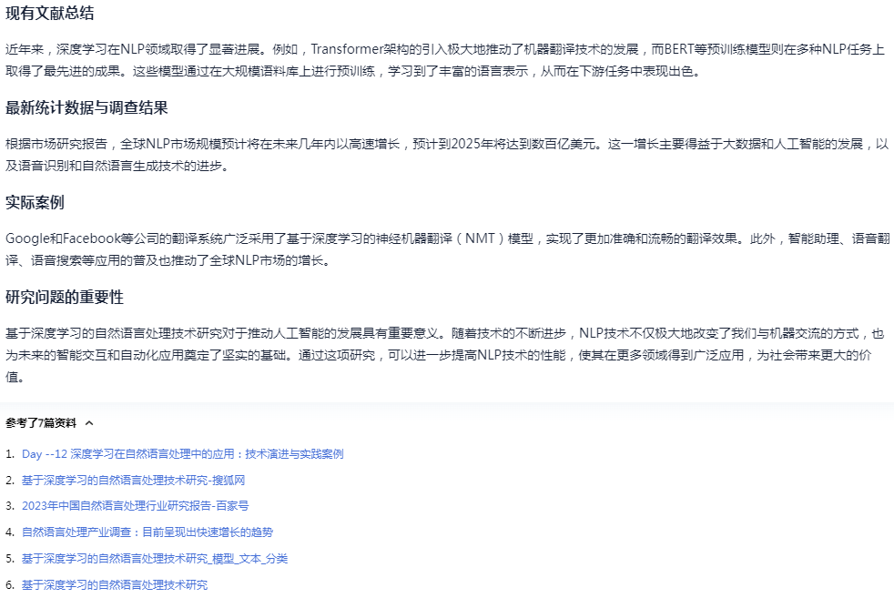 指令:我正在做课题申报,请帮我精准定义研究问题。具体研究问题是“基于深度学习的自然语言处理技术研究”,需要你简要总结与我研究领域相关的现有文献,提供与这项研究问题相关的最新统计数据、调查结果或实际案例,并论述该研究问题的重要性。