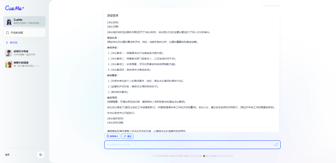 来自CueMe的温馨提醒:尽管AI可以生成文本,但您需要确保生成的内容准确无误,并符合相关的法律法规和政策要求。另外,AI是一个辅助工具,不能完全替代人类的判断和创意。在使用AI撰写公文时,工作人员应保持独立思考,对生成的文本进行适当的修改和优化,更需仔细核对,确保公文的语言流畅、逻辑清晰,且无任何错误或不当之处。同时,在使用AI工具处理公文时,尤其是涉及机密或敏感信息,需要确保工具的安全性和数据保护措施,避免信息泄露。