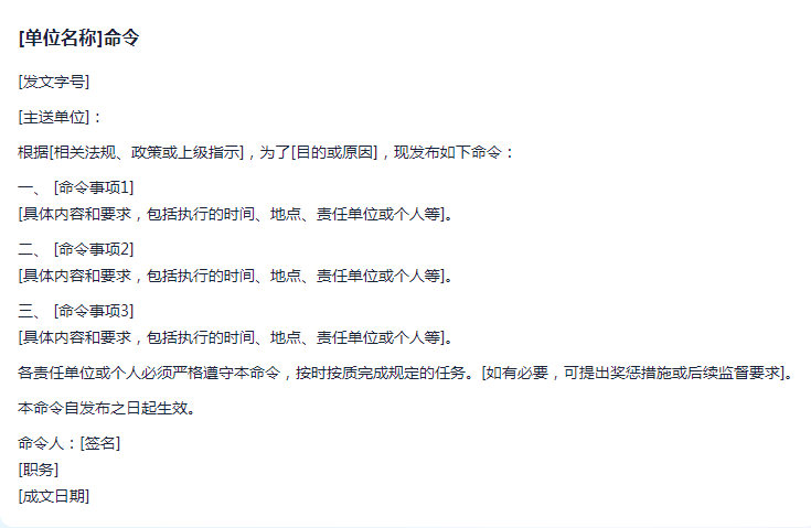 命令是法定领导机关或领导人发布的公文,代表了国家或组织的意志和决策。命令具有明确的指挥功能,涉及的内容通常是重要的行政法规、规章、重大政策措施或对重要人员的任免等。“命令”在公文写作中具有极其重要的地位。
