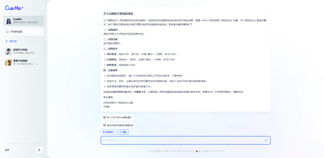 来自CueMe的温馨提醒:尽管AI可以生成文本,但您需要确保生成的内容准确无误,并符合相关的法律法规和政策要求。另外,AI是一个辅助工具,不能完全替代人类的判断和创意。在使用AI撰写公文时,工作人员应保持独立思考,对生成的文本进行适当的修改和优化,更需仔细核对,确保公文的语言流畅、逻辑清晰,且无任何错误或不当之处。同时,在使用AI工具处理公文时,尤其是涉及机密或敏感信息,需要确保工具的安全性和数据保护措施,避免信息泄露。