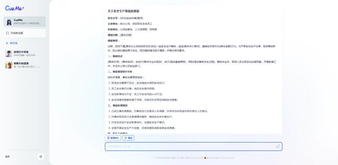 我们现在可以尝试让AI帮我们写一份关于安全生产事故的通报: