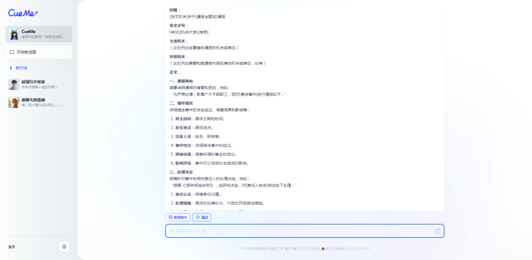 来自CueMe的温馨提醒:尽管AI可以生成文本,但您需要确保生成的内容准确无误,并符合相关的法律法规和政策要求。另外,AI是一个辅助工具,不能完全替代人类的判断和创意。在使用AI撰写公文时,工作人员应保持独立思考,对生成的文本进行适当的修改和优化,更需仔细核对,确保公文的语言流畅、逻辑清晰,且无任何错误或不当之处。同时,在使用AI工具处理公文时,尤其是涉及机密或敏感信息,需要确保工具的安全性和数据保护措施,避免信息泄露。