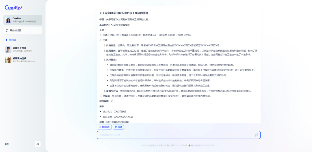 来自CueMe的温馨提醒:尽管AI可以生成文本,但您需要确保生成的内容准确无误,并符合相关的法律法规和政策要求。另外,AI是一个辅助工具,不能完全替代人类的判断和创意。在使用AI撰写公文时,工作人员应保持独立思考,对生成的文本进行适当的修改和优化,更需仔细核对,确保公文的语言流畅、逻辑清晰,且无任何错误或不当之处。同时,在使用AI工具处理公文时,尤其是涉及机密或敏感信息,需要确保工具的安全性和数据保护措施,避免信息泄露。