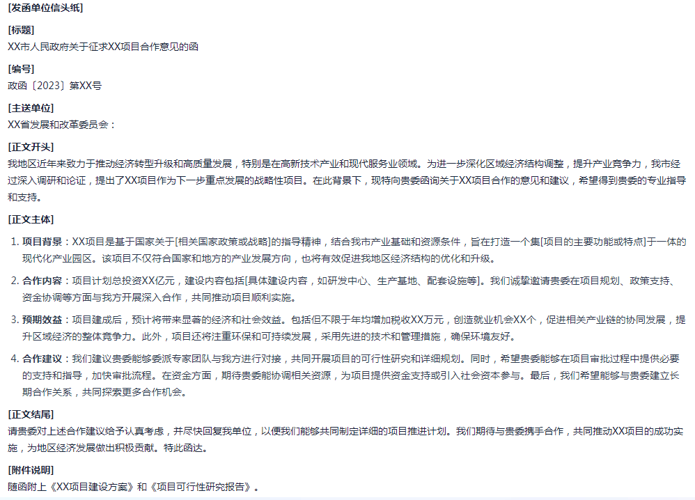 AI详细写明了项目背景与合作内容,我们只需要将[]中的信息补充完善,比如[相关国家政策或战略]、[项目的主要功能或特点]、[具体建设内容,如研发中心、生产基地、配套设施等]信息,就可以得到一份相对完整的征求意见函。