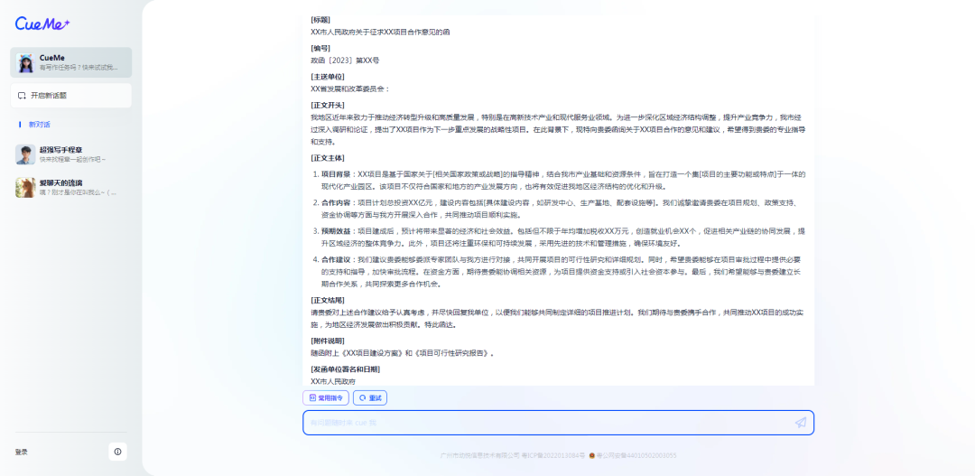 我们使用指令,让AI帮我们写一份征求合作意见的公函,看看结果如何: