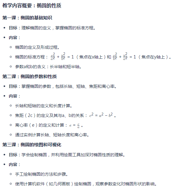 指令:根据“椭圆的性质,包括长轴、短轴的长度计算及离心率的求解”这个知识点,帮我制作教学内容