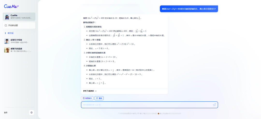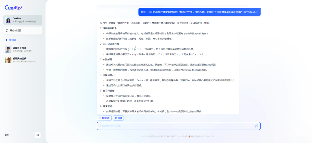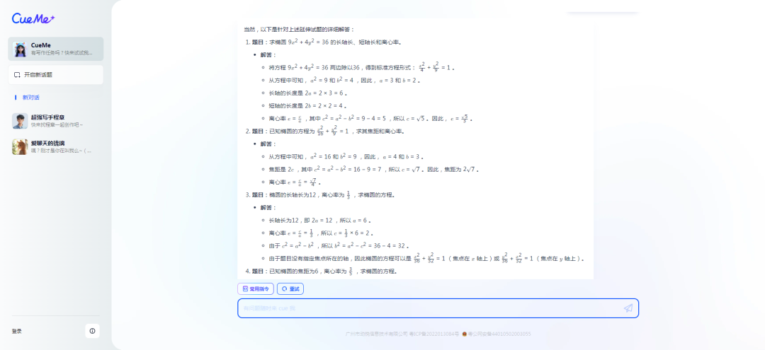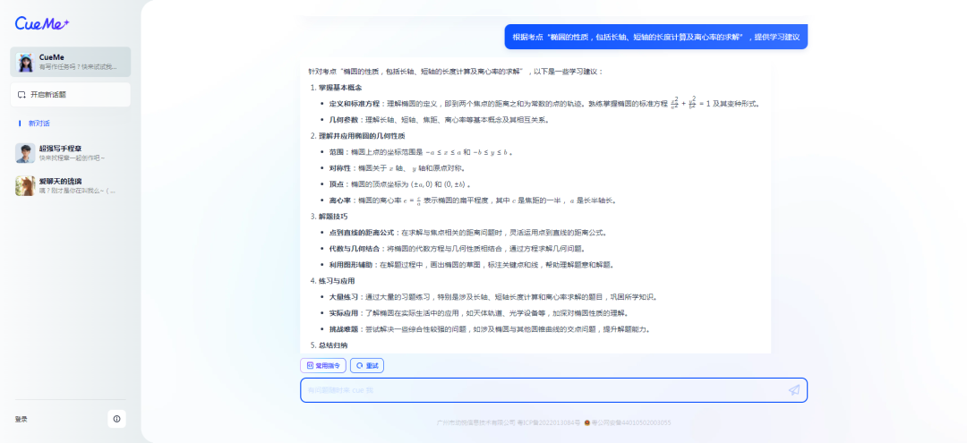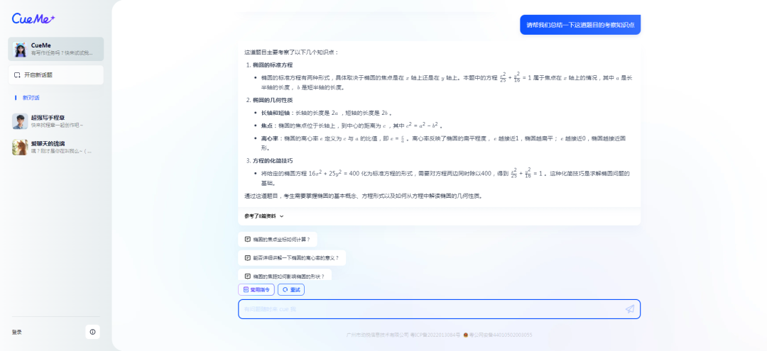 可以看出来,CueMe可以准确的列出这道题的考点是“椭圆的性质,包括长轴、短轴的长度计算及离心率的求解”问题,并详细拆解成“椭圆的标准方程”、“椭圆的几何性质”、“方程的化简技巧”三个部分。