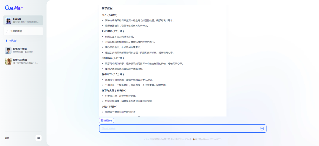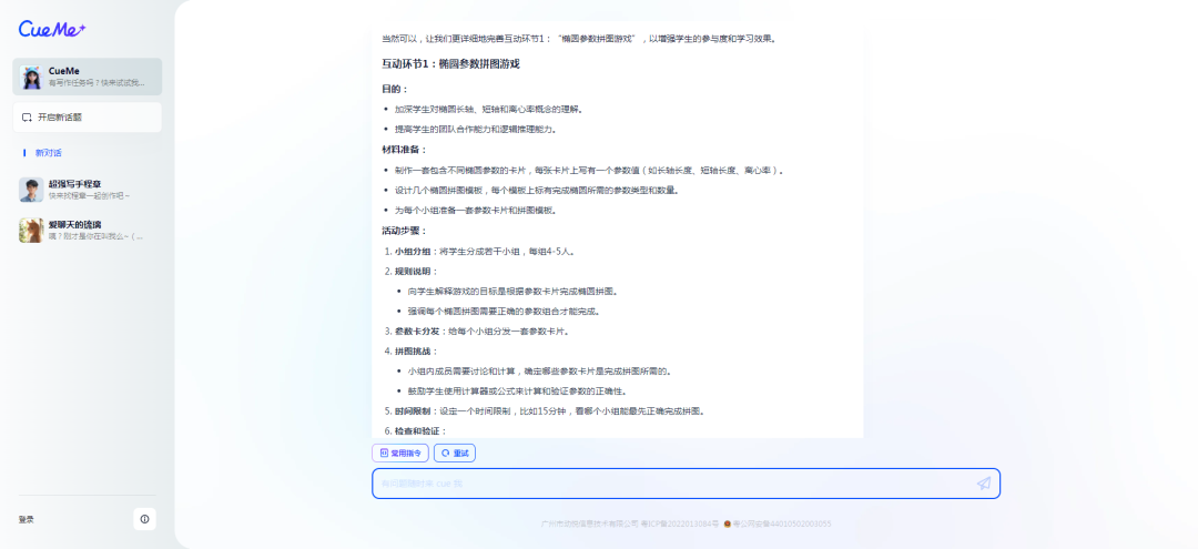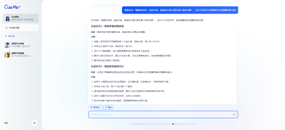 从返回结果上来看,AI设定了四个互动环节,并且列出了详细的步骤,通过这些互动环节,学生不仅能够在实践中学习和应用椭圆的性质,还能通过团队合作和讨论加深对知识点的理解,同时提高他们的沟通和解决问题的能力。