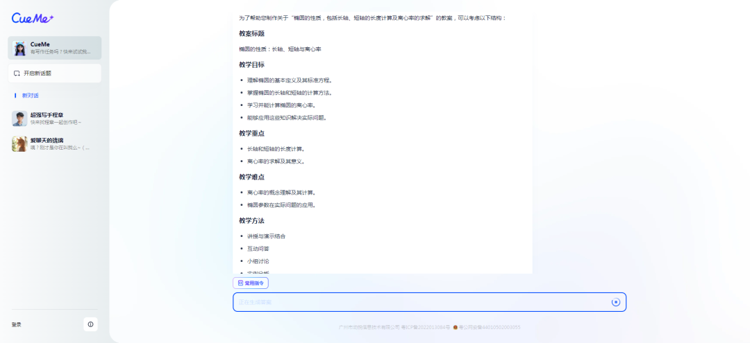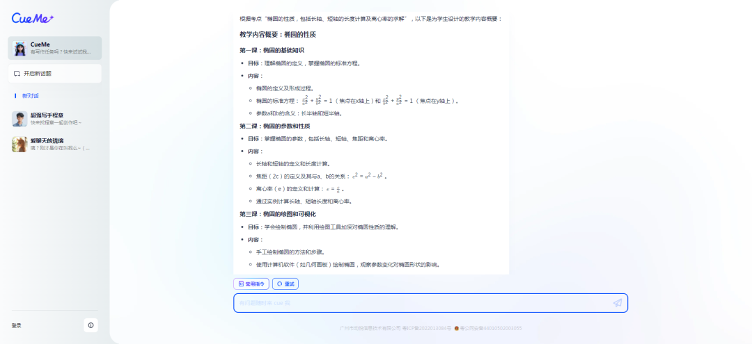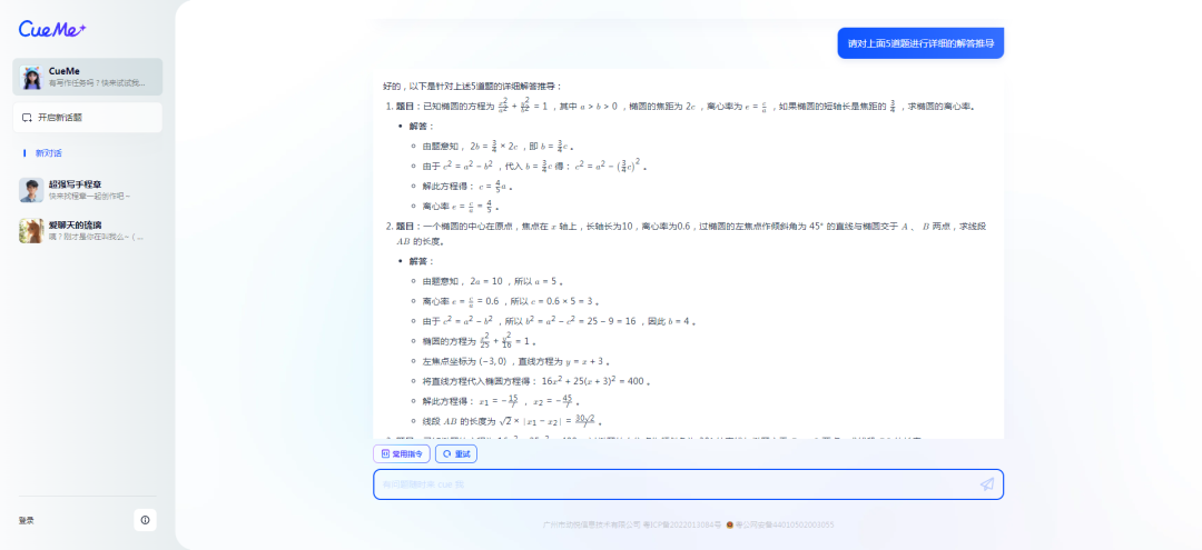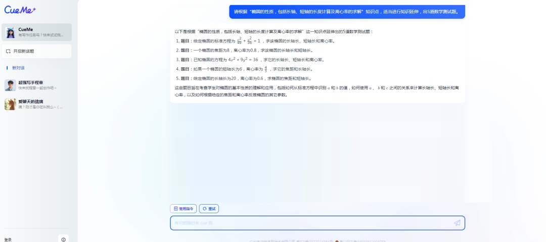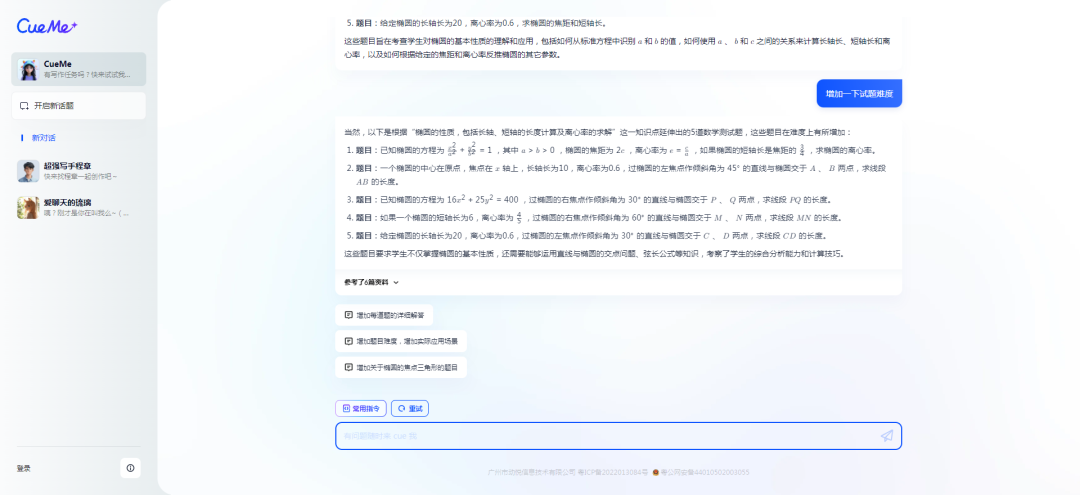 并且在第二次生成的结果中,AI还告诉我,“这些题目要求学生不仅掌握椭圆的基本性质,还需要能够运用直线与椭圆的交点问题、弦长公式等知识,考察了学生的综合分析能力和计算技巧。”。