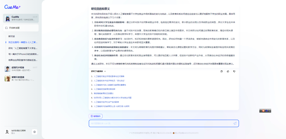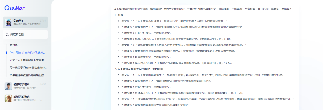 这里我们需要用“角色设定+指令词”的方式,进一步让CueMe帮我们进行查找引用。