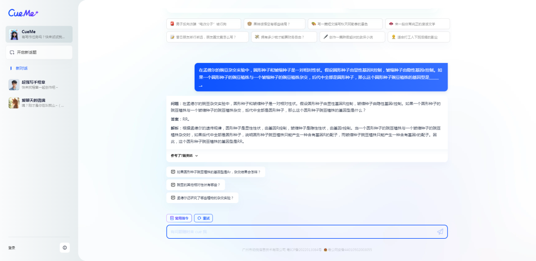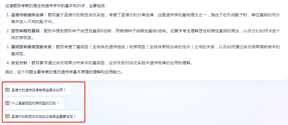 我们这里以“孟德尔遗传规律中的显隐性关系以及杂交后代的表现型”作为考察知识点,看看AI对生物方面的学科知识了解多少。