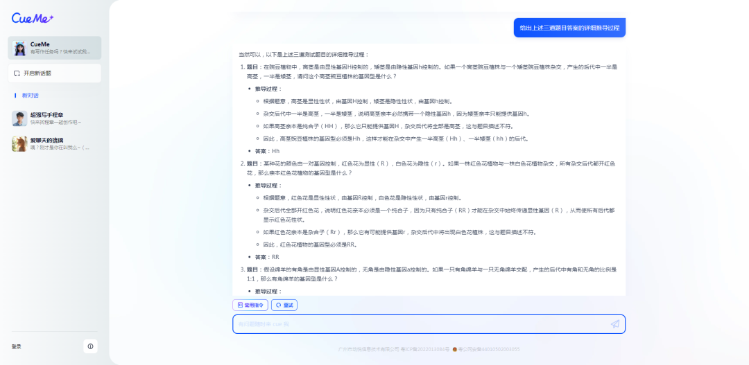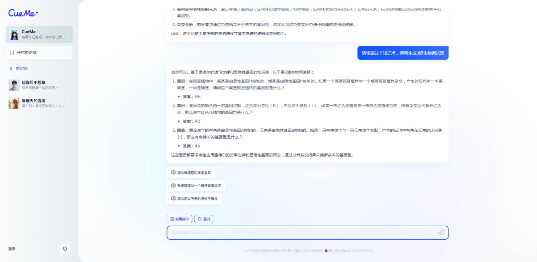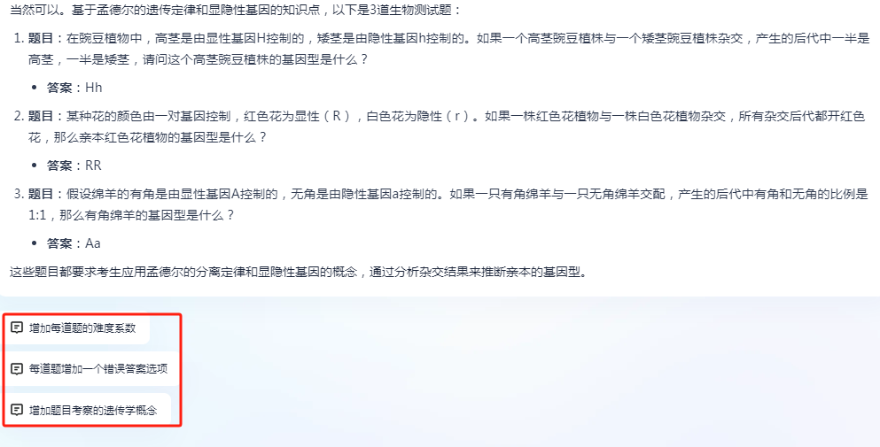 然后,很快AI就基于孟德尔的遗传定律和显隐性基因的知识点,给出了三道测试题目。