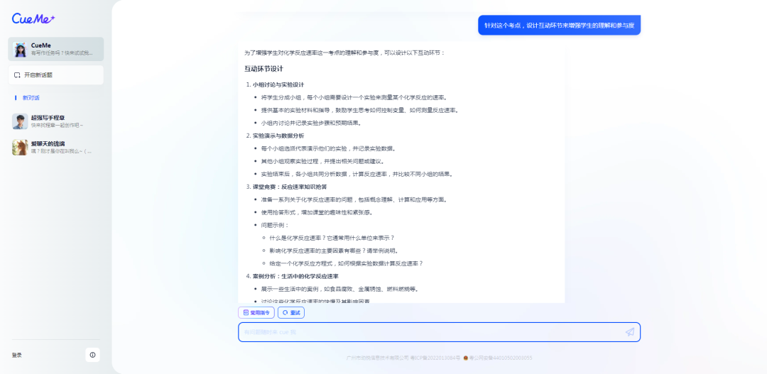 为了增强学生对化学反应速率这一考点的理解和参与度,AI帮我们设计了上面的互动环节。