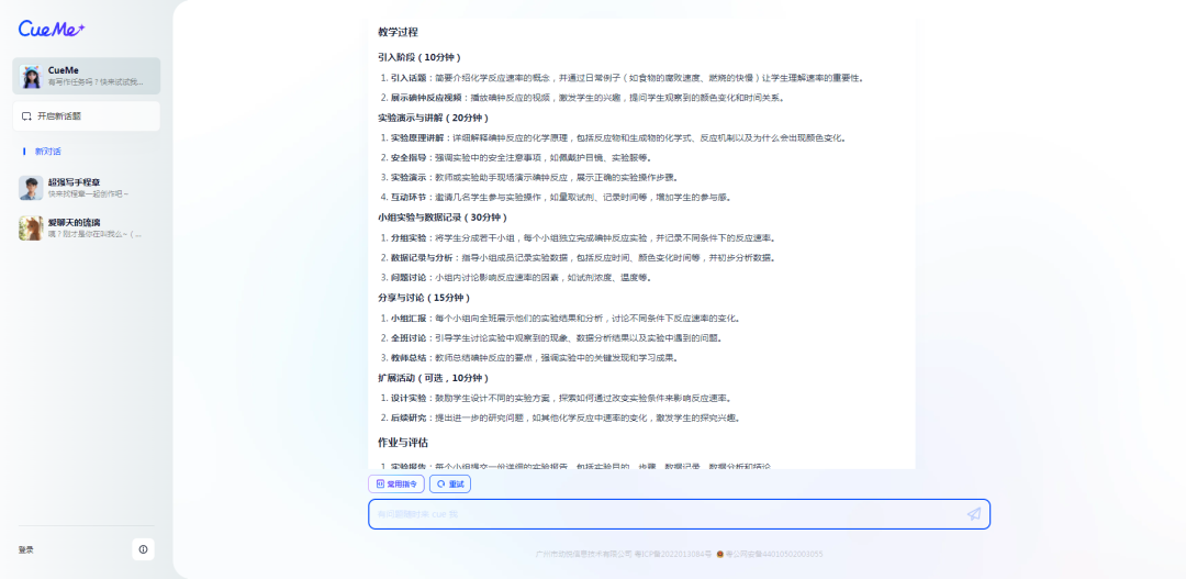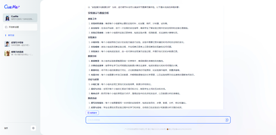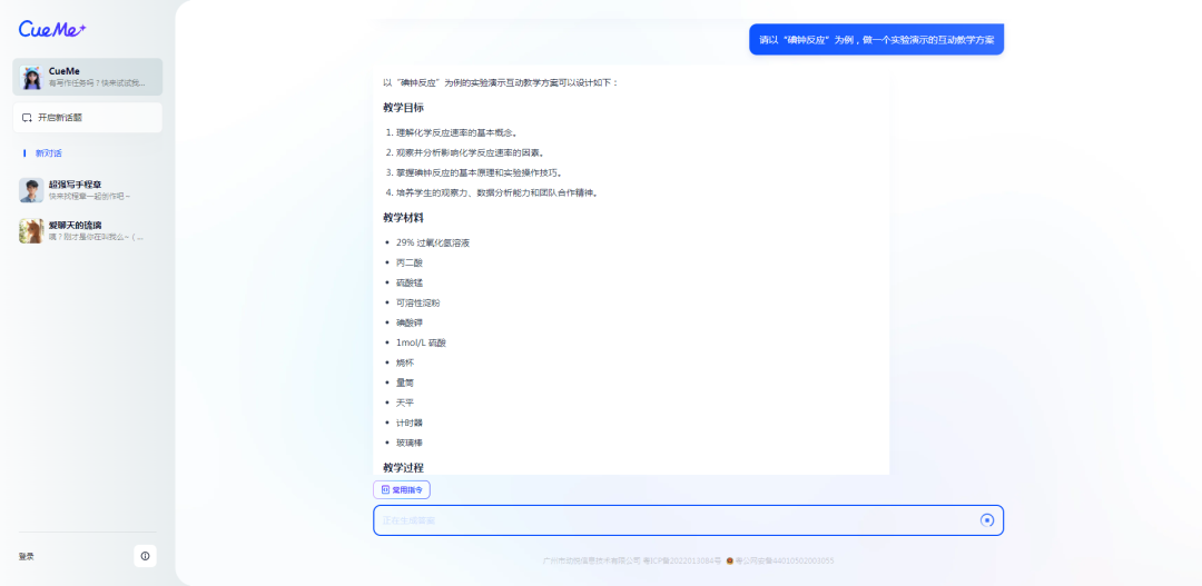我们这里用“碘钟反应”来进行举例,结合之前AI的建议,我们可以把指令设计如下: