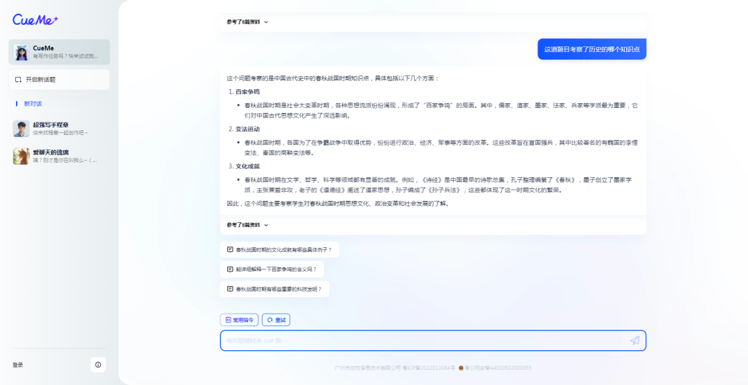 而作为学科知识点的延伸,历史老师也可以借助CueMe提供的推荐问题,进行知识点的拓展,更进一步的帮助学生梳理知识框架。