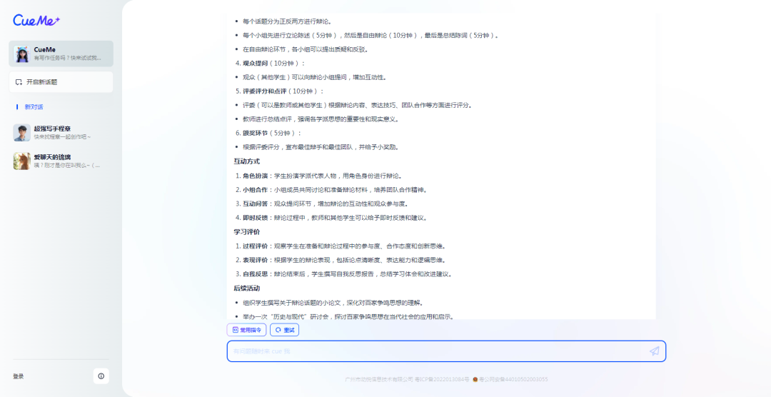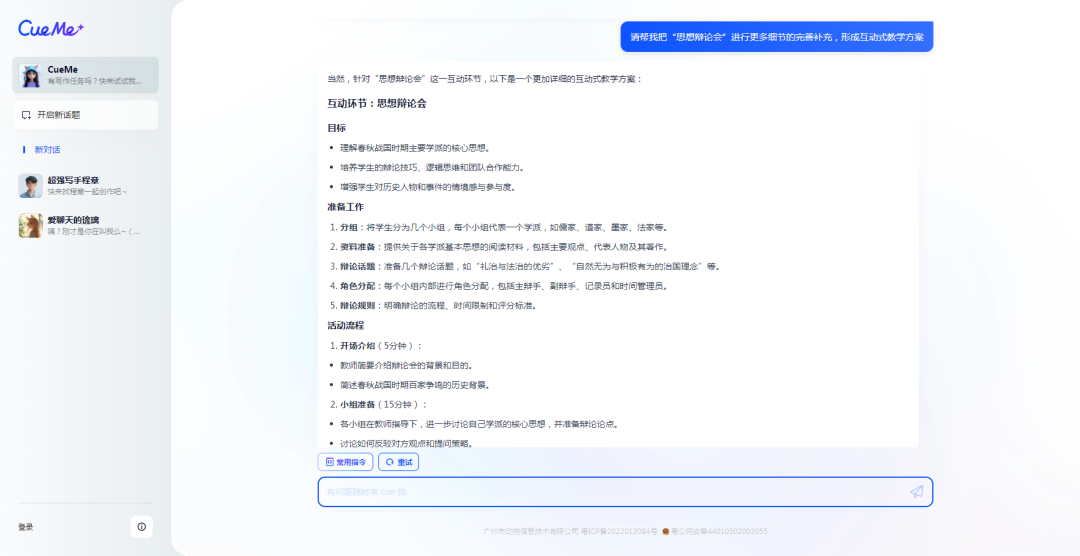 在互动环节设计方面,AI给出了“时空穿梭者”角色扮演、“思想辩论会”、“历史事件重构”小组活动、“文化影响探析”讨论会、“历史与现代对话”写作工作坊等5个小方案,并且还给出了实施建议。