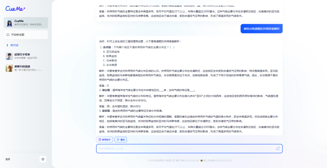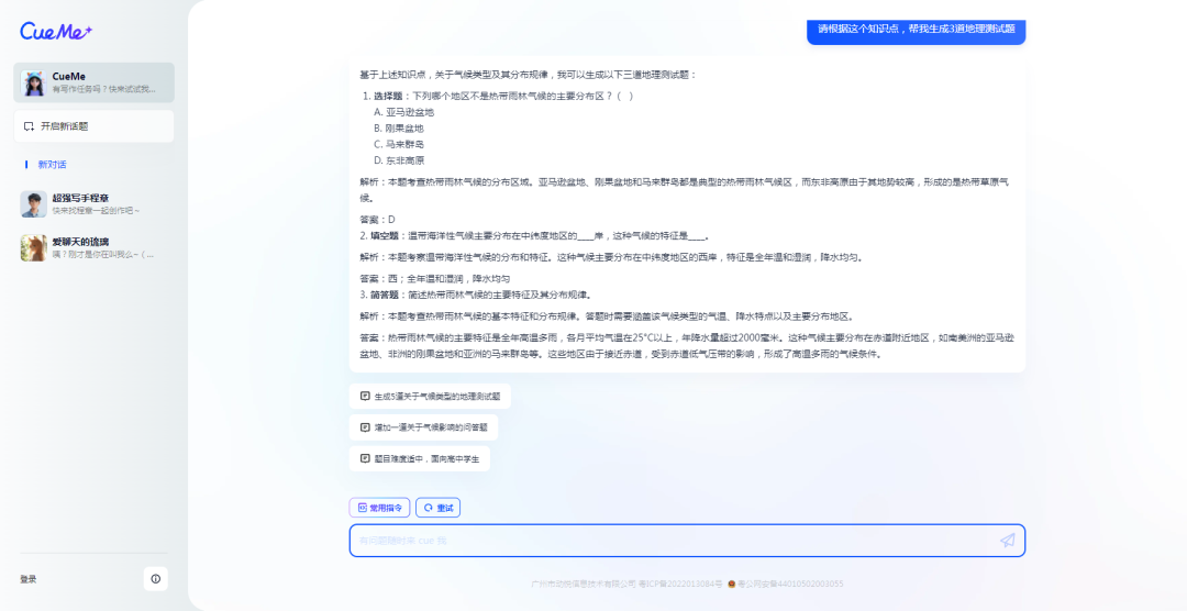 AI很“自觉地”生成了覆盖选择题、填空题和简答题的三种考试题型,可以从多个维度,考评学生对于知识点的掌握情况。