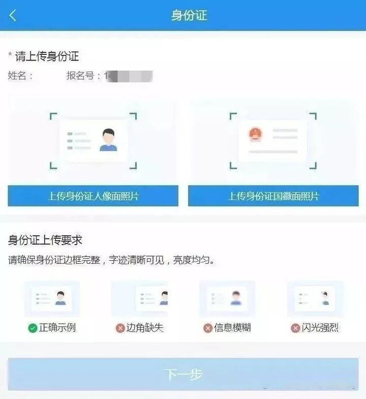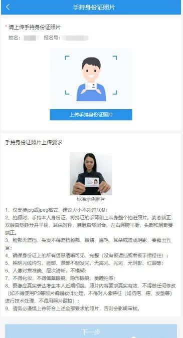 手持身份证照片同样按要求拍摄,本人不能化妆、戴眼镜,身份证上的信息要保证清晰。