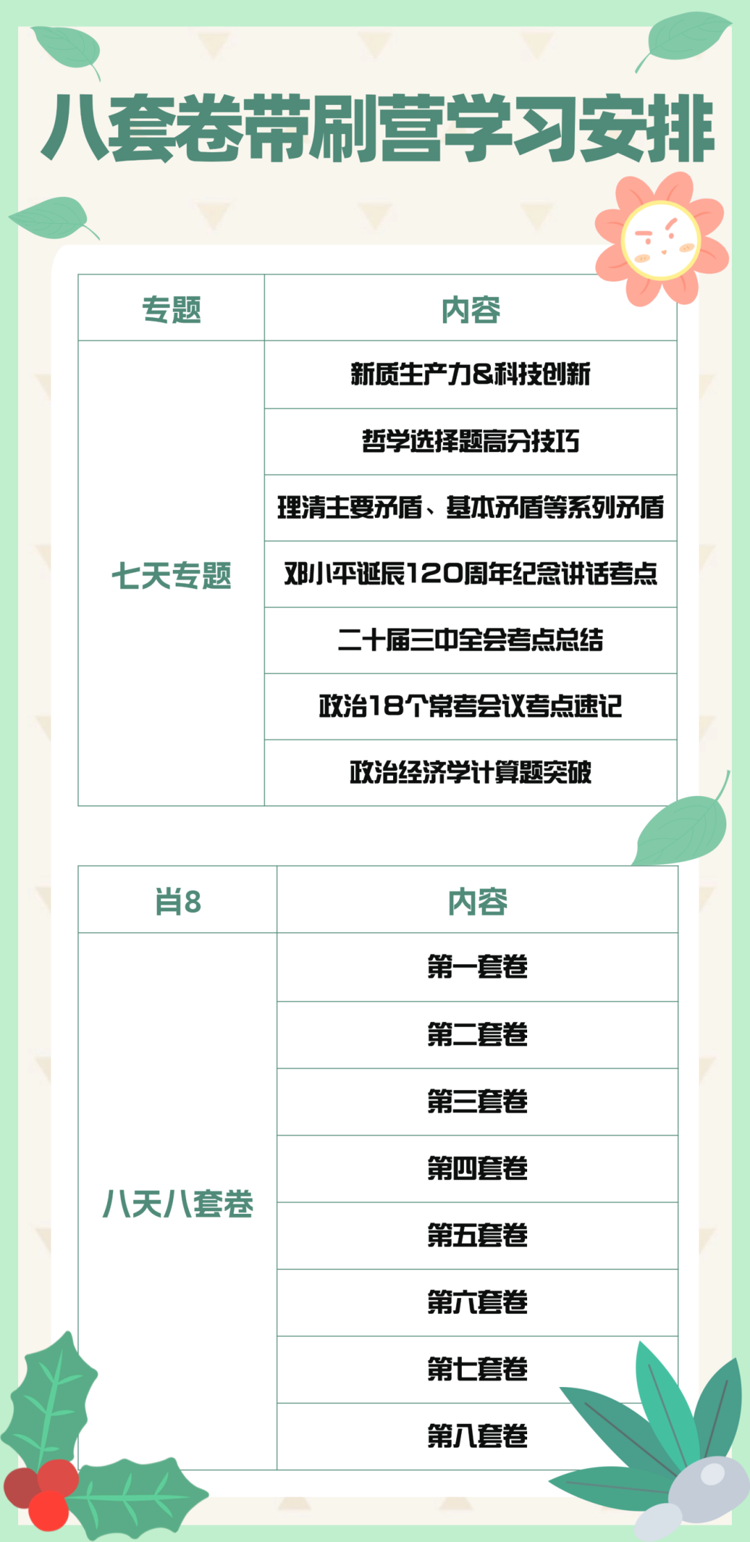在七天专题背诵学习的期间,我们穿插完成《8套卷》,小程序刷题,配和使用《肖8使用手册》+选择题视频解析+《背诵提纲》,完全吃透肖8所有考点!!!