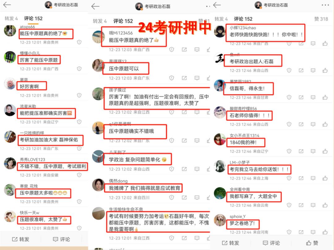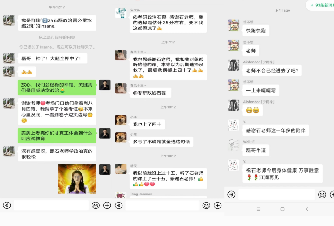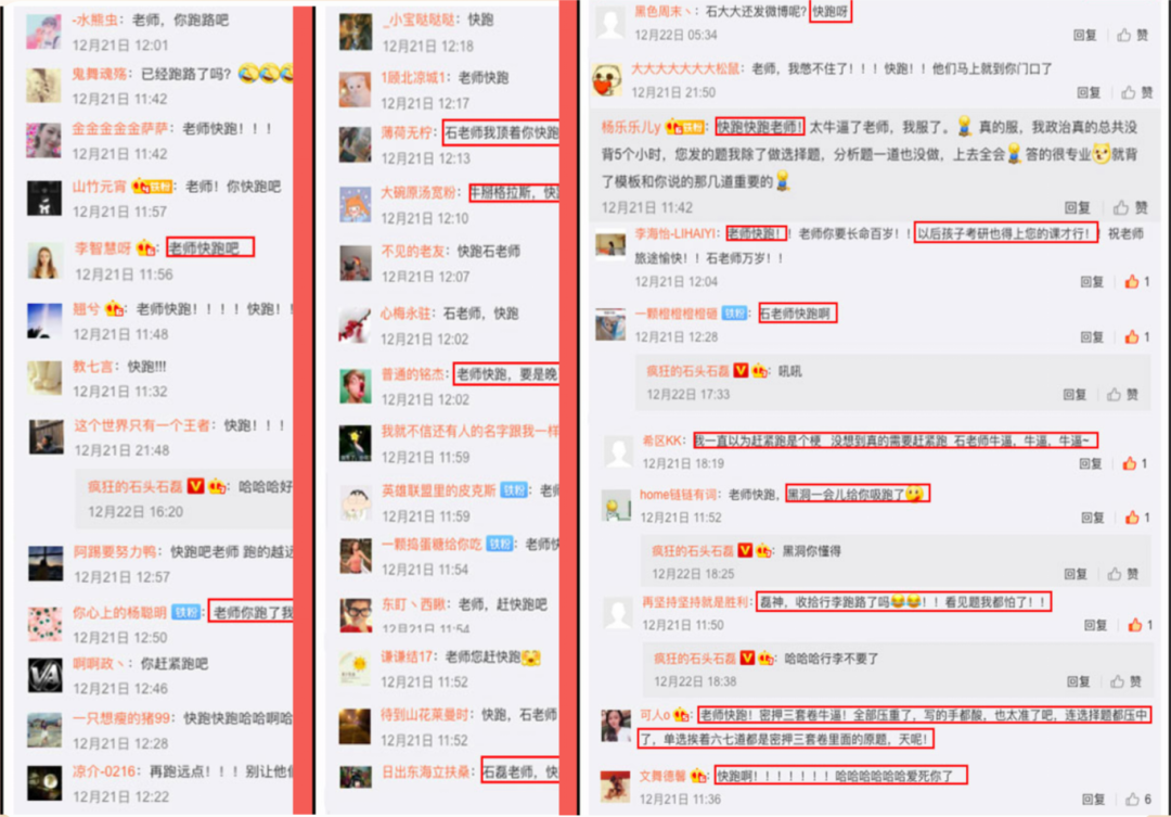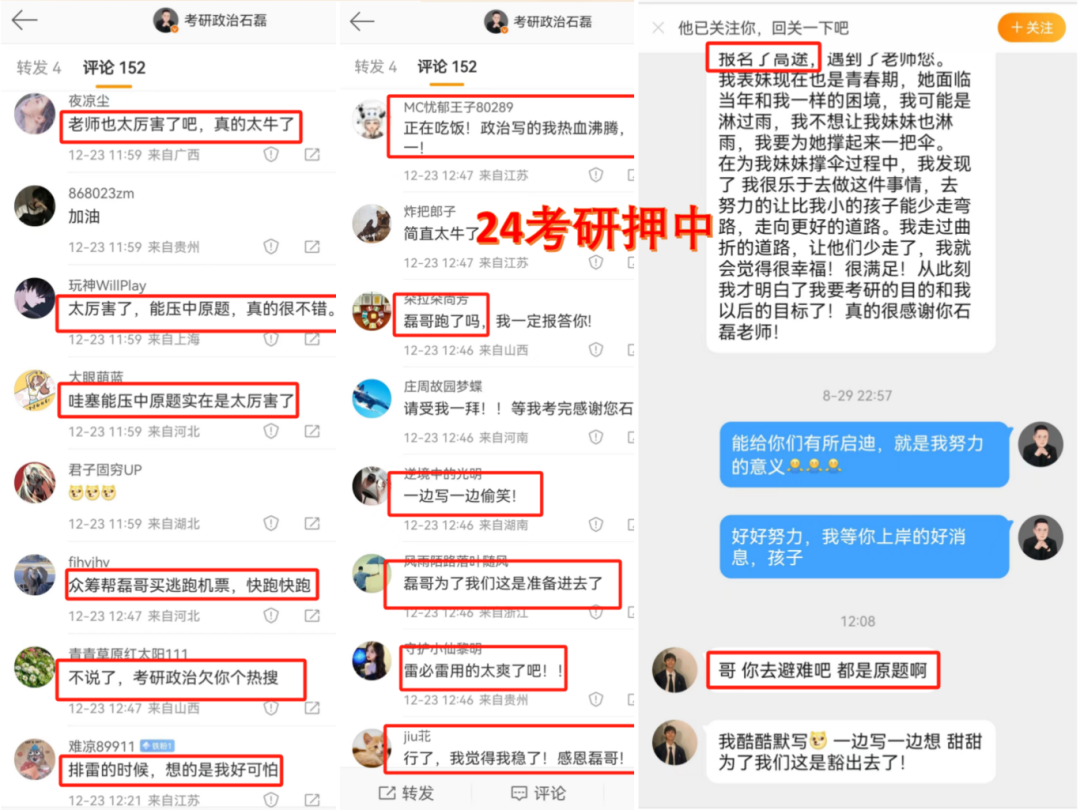 每年考试结束大量考生在石老师官方微博留言直呼“老师快跑”,超高命中率让石老师弟子政治平均成绩都在75+分