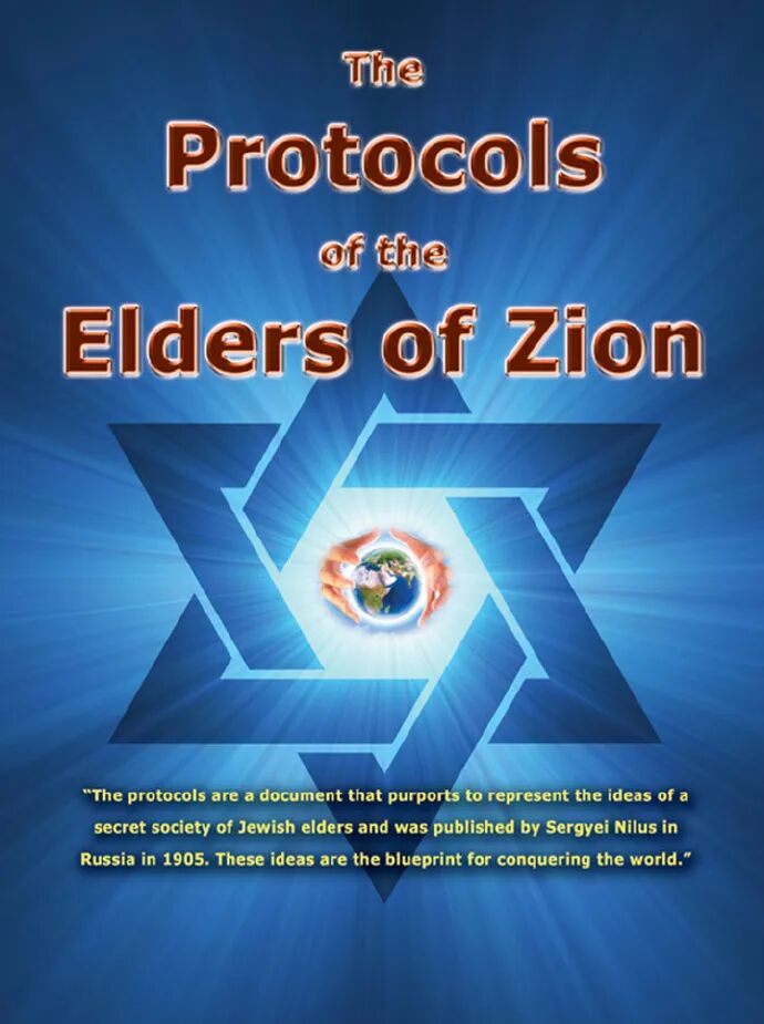20世纪初流传出来的《锡安长老会纪要》(Протоколысионскихмудрецов)。内容据称是一群所谓犹太锡安长老会秘密会议,阴谋夺取世界统治权控制全人类的会议纪要。来历不明,作者不明。