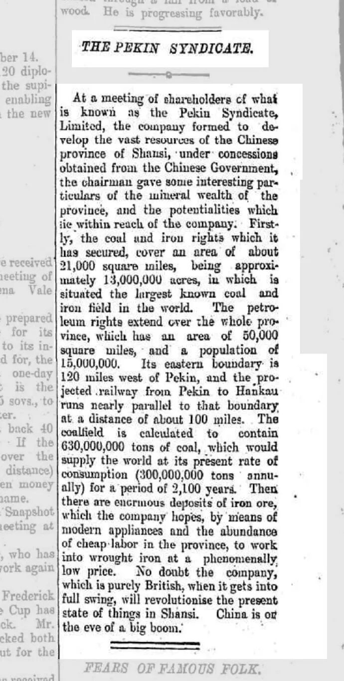 据统计:福公司获准勘探和开采的范围达21000平方英里,根据当时的勘探报告,预计煤炭储量高达9000亿吨,如全面生产,年利润将高达75万英镑(约合750万两白银)。