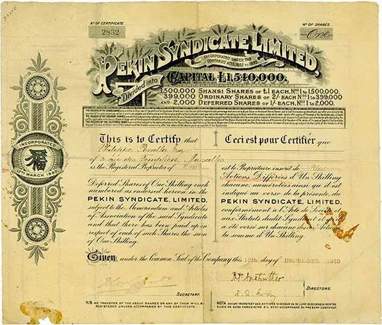 据洛希尔(罗氏)基金会档案中另一份汇票副本收据显示,1899年,李鸿章通过汇丰银行汇款4203英镑(约合当时4万两白银),购买福公司的“递延股”(Deferred Share)。福公司原始注册资本2万英镑,主要为洛希尔基金投资。李鸿章的私人家族股份约相当于25%。