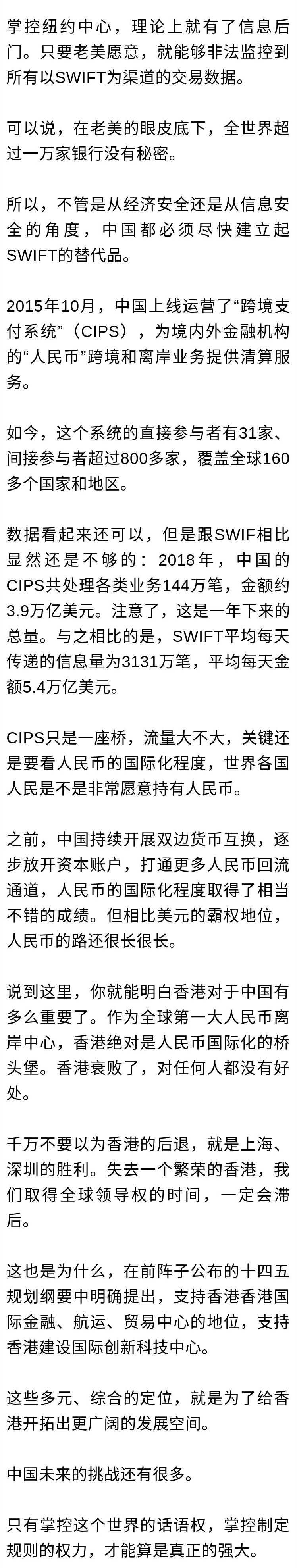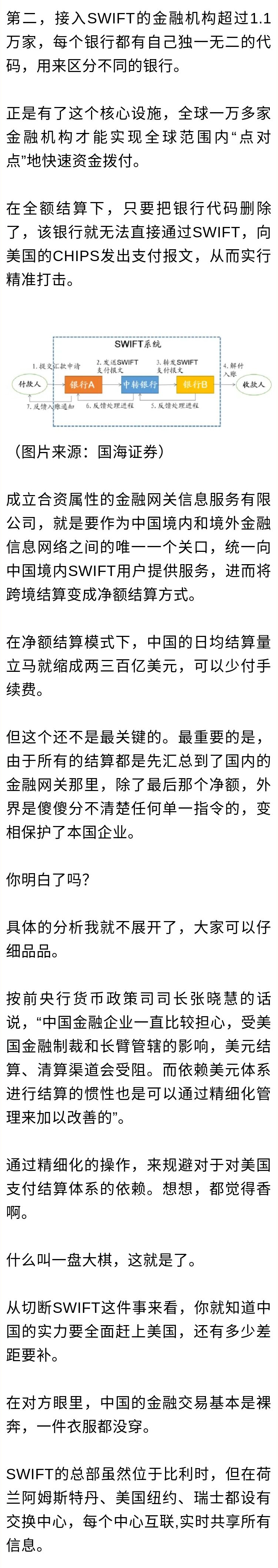 再一次认认真真地看完,中国支付清算系统什么时候强大了,人民币的国际化也就强大了。如果我们不在现如今的国家货币清算系统,我们就只能拿手里的美元跟人家玩,甚至是黄金。建设自己的很重要,但先要保住已经拥有的。就像华为,自己可以研发芯片、系统,但在成熟之前还是先要用人家的。我们的祖国真的在各个方面都强大了,才真的不会被卡脖子,人家都算好了哪些行业是能卡死我们的,我们得努力突破,加油!祖国!