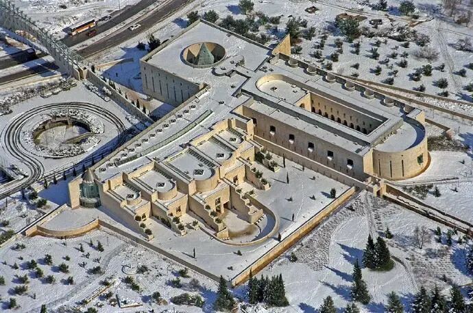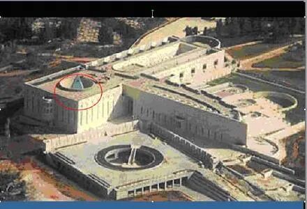 以色列最高法院俯瞰图,上面圆圈中有金字塔造型,广场有方尖碑。