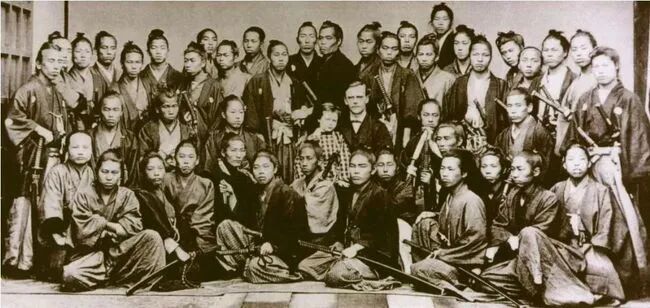 照片中坐在前排中央的是明治天皇的顾问荷兰银行代理人Guido Verbeck,其他人都按地位排定位置。