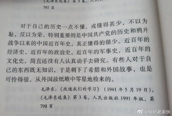 对于自己的历史一点不懂,或懂得甚少,不以为耻,反以为荣。特别重要的是中国共产党的历史和鸦片战争以来的中国近百年史,真正懂得的很少。近百年的经济史,近百年的政治史,近百年的军事史,近百年的文化史,简直还没有人认真动手去研究。有些人对于自己的东西既无知识,于是剩下了希腊和外国故事,也是可怜得很,从外国故纸堆中零星地捡来的。