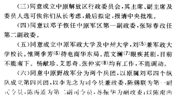 可注意的是关于中原解放军之建制,中央决定设立四个兵团,包括原华野(华东野战军)部分兵力及原中野兵力共计四个兵团。