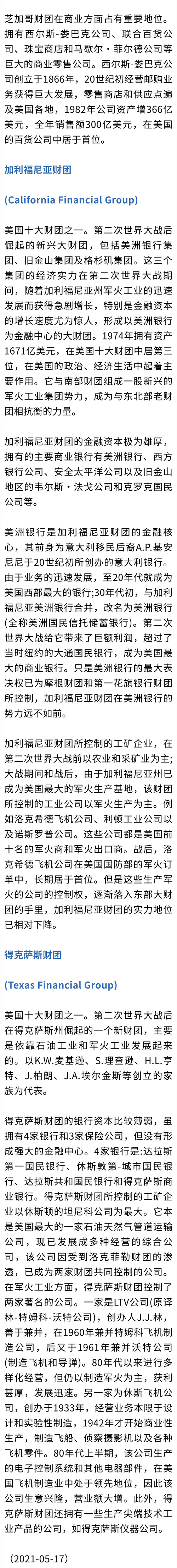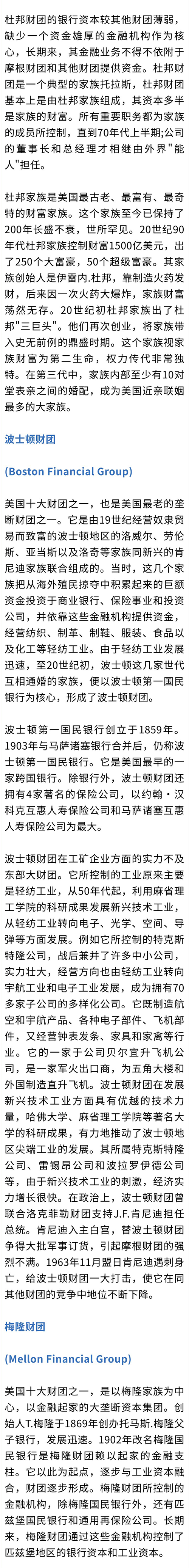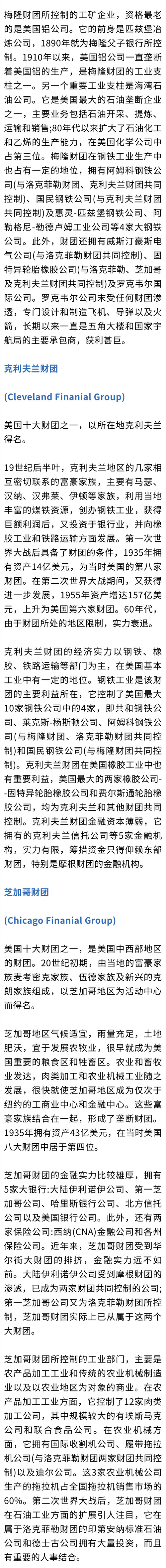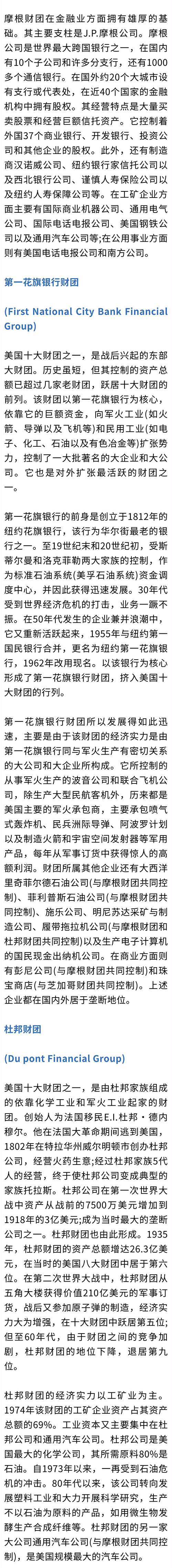 第二次世界大战前,有摩根-第一国民银行、洛克菲勒、库恩-洛布、芝加哥、梅隆、杜邦、波士顿以及克利夫兰等八大财团。