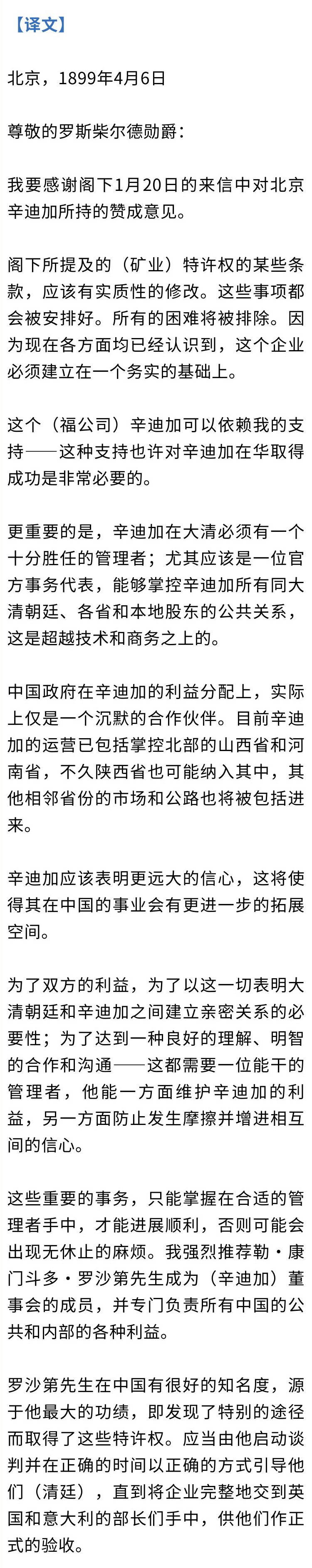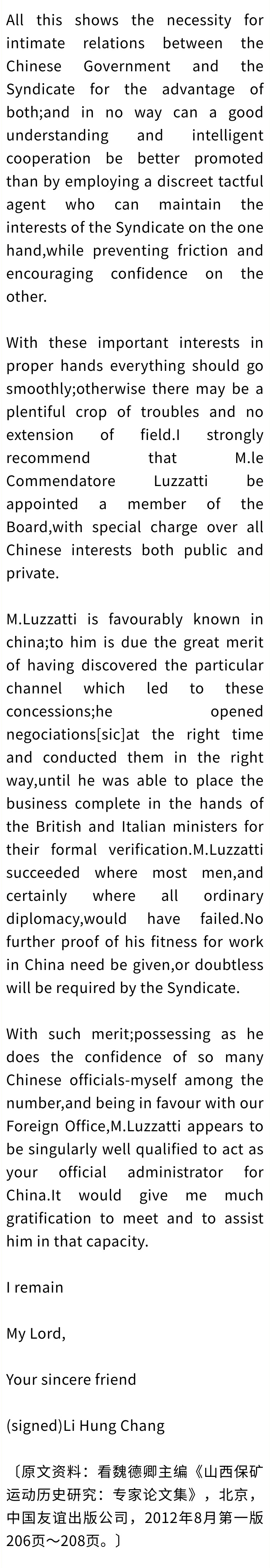 李鸿章的信件写于1899年4月,时李鸿章赋闲无职务。次年初李鸿章任两广总督,义和团兴起,八国联军攻进北京。此信发表于《THE ROTHSCHILD ARCHIVE》《罗斯柴尔德家族档案》中。